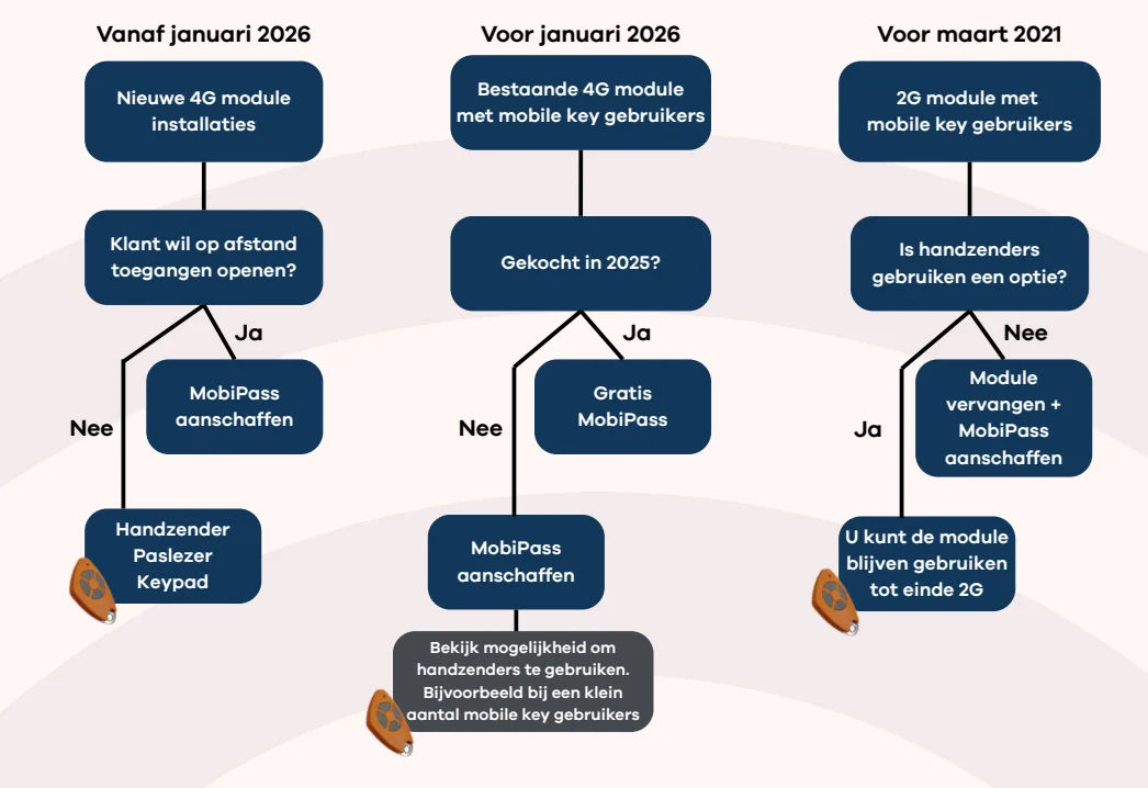 Het einde van flash calling vraagt om actie. Om te voorkomen dat jouw toegangssystemen vanaf mei 2026 niet meer op afstand geopend kunnen worden, is het belangrijk om tijdig over te stappen naar modules die MobiPass ondersteunen. Dit zorgt ervoor dat bewoners, medewerkers of leveranciers zonder onderbreking toegang behouden.